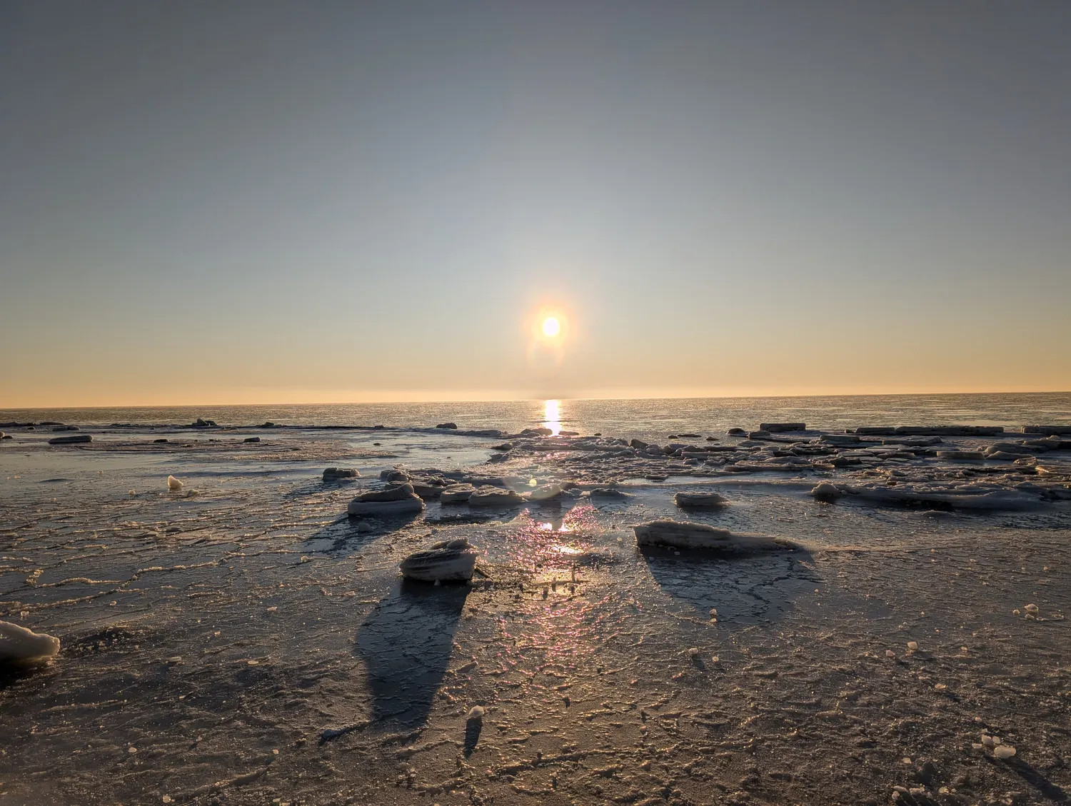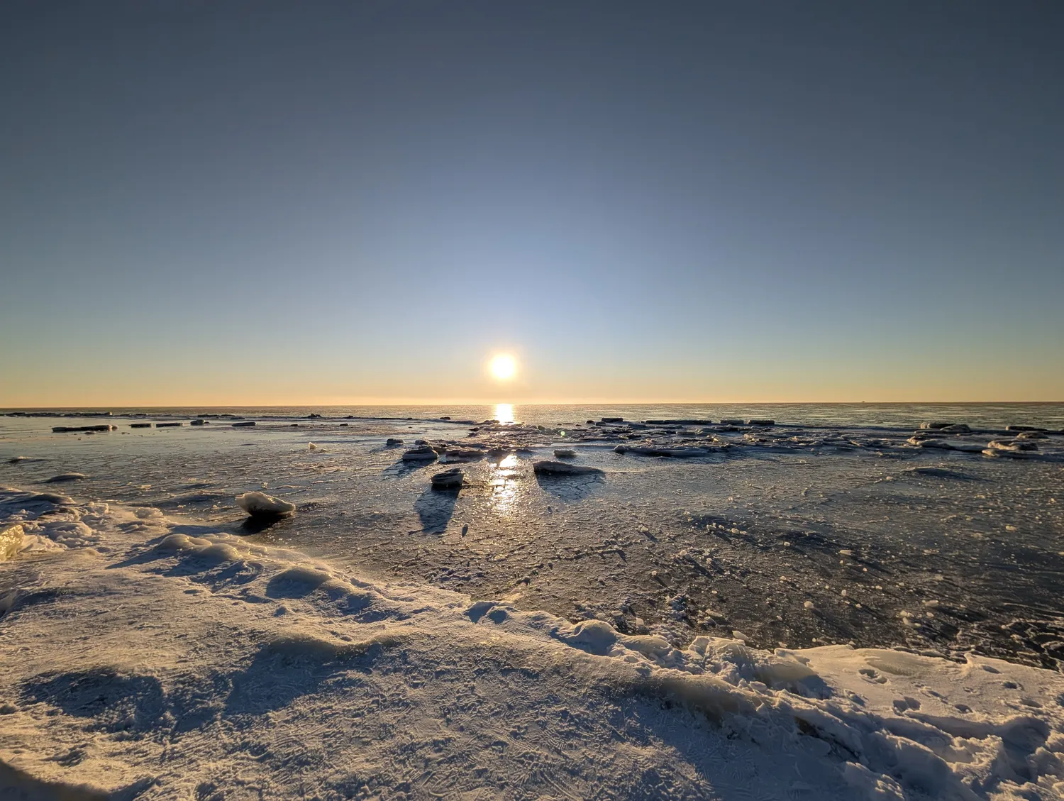 - Šviesos žaismas: Atkreipkite dėmesį, kaip saulės spinduliai atsimuša į drėgną ledą, sukurdami ilgą, spindintį taką, vedantį tiesiai į horizontą. Tai vaizdas, kuris šildo, net kai lauke spaudžia šaltukas.