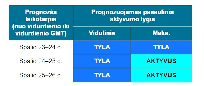 Nepaisant neseniai įvykusio galingo Saulės žybsnio, spalio 23–24 d. magnetinių audrų neprognozuojama. Žemė šiuo metu yra už tiesioginio Saulės žybsnio poveikio zonos ribų, o geomagnetinis laukas yra stabilus.