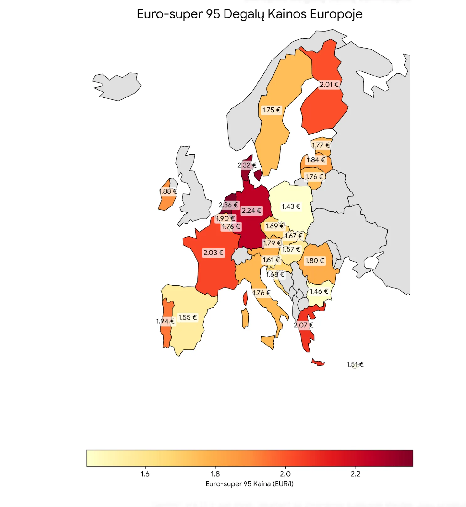 Brangiausiose ES valstybėse situacija dar sunkesnė. Nyderlanduose benzinas jau viršija 2,30 euro už litrą, o dyzelinas pakilo net iki maždaug 2,58 euro. Danijoje ir Vokietijoje kainos taip pat išlieka tarp didžiausių visoje Sąjungoje. Tai jau nebe kosmetinis pabrangimas, o realus gyvenimo kaštų šuolis, kurį žmonės jaučia kiekvieną savaitę.