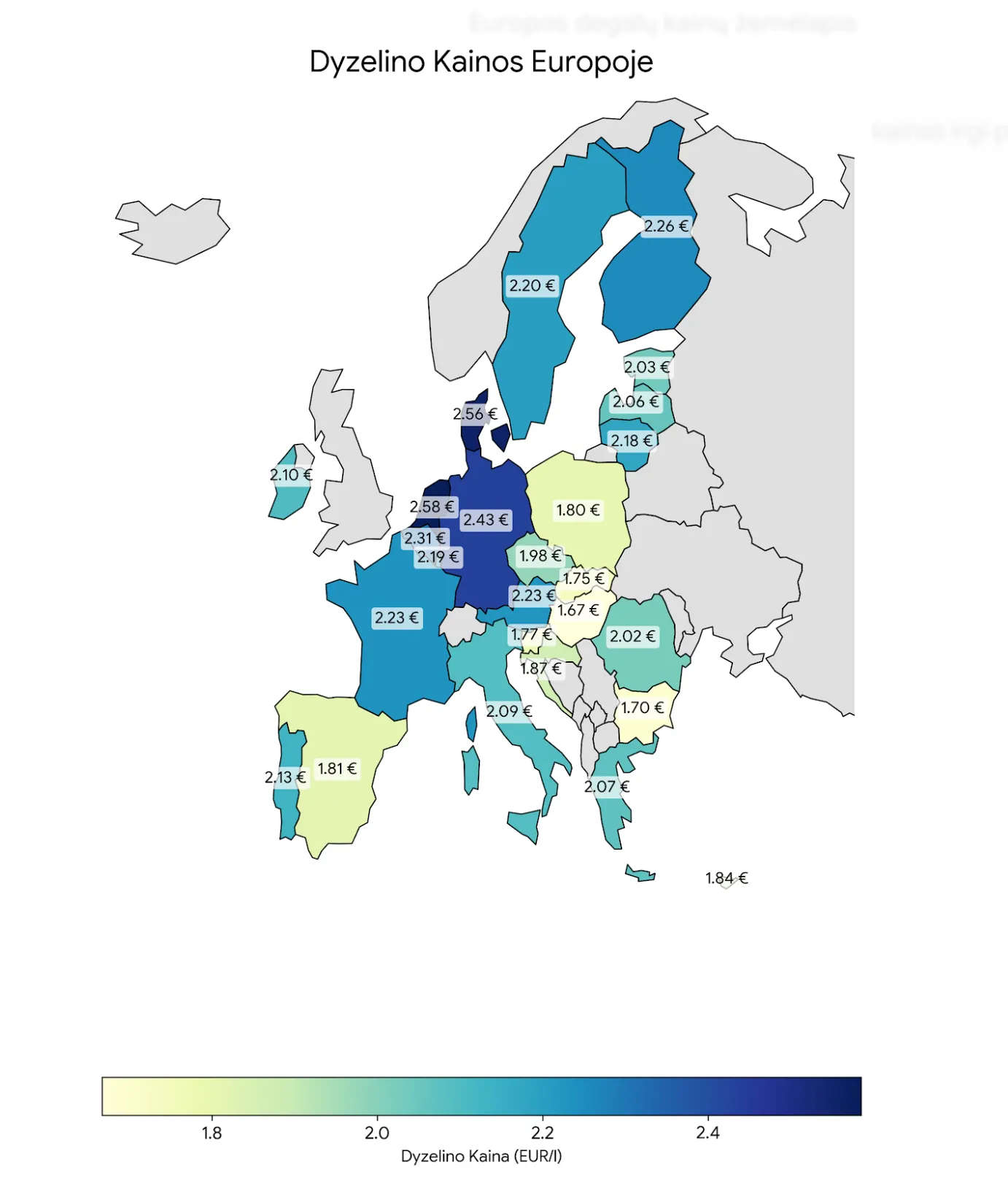 Pagal naujausią Europos Komisijos savaitinį naftos biuletenį, visoje ES 95 benzino vidutinė kaina balandžio pradžioje sukosi apie 1,80 euro už litrą, o dyzelino – apie 2,04 euro. Tai reiškia, kad dyzelinas jau visos Europos mastu perkopė labai psichologiškai jautrią ribą.