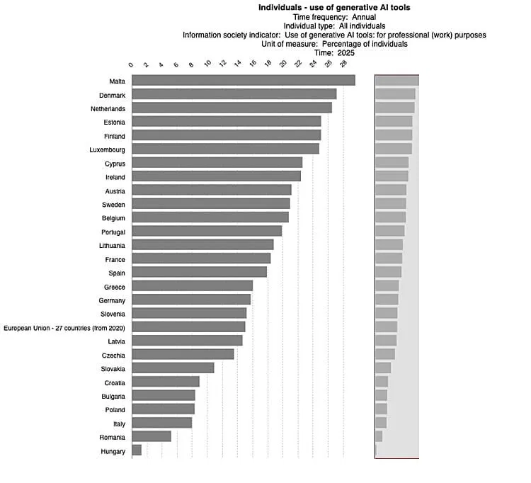 Panaši tendencija persikelia ir į profesinę aplinką. Kiek daugiau nei 15 proc. europiečių teigia naudojantys generatyvinį DI darbe. Ir vėl – skaitmeniniu požiūriu brandžios mažosios šalys (Malta, Danija, Nyderlandai) diktuoja madas.