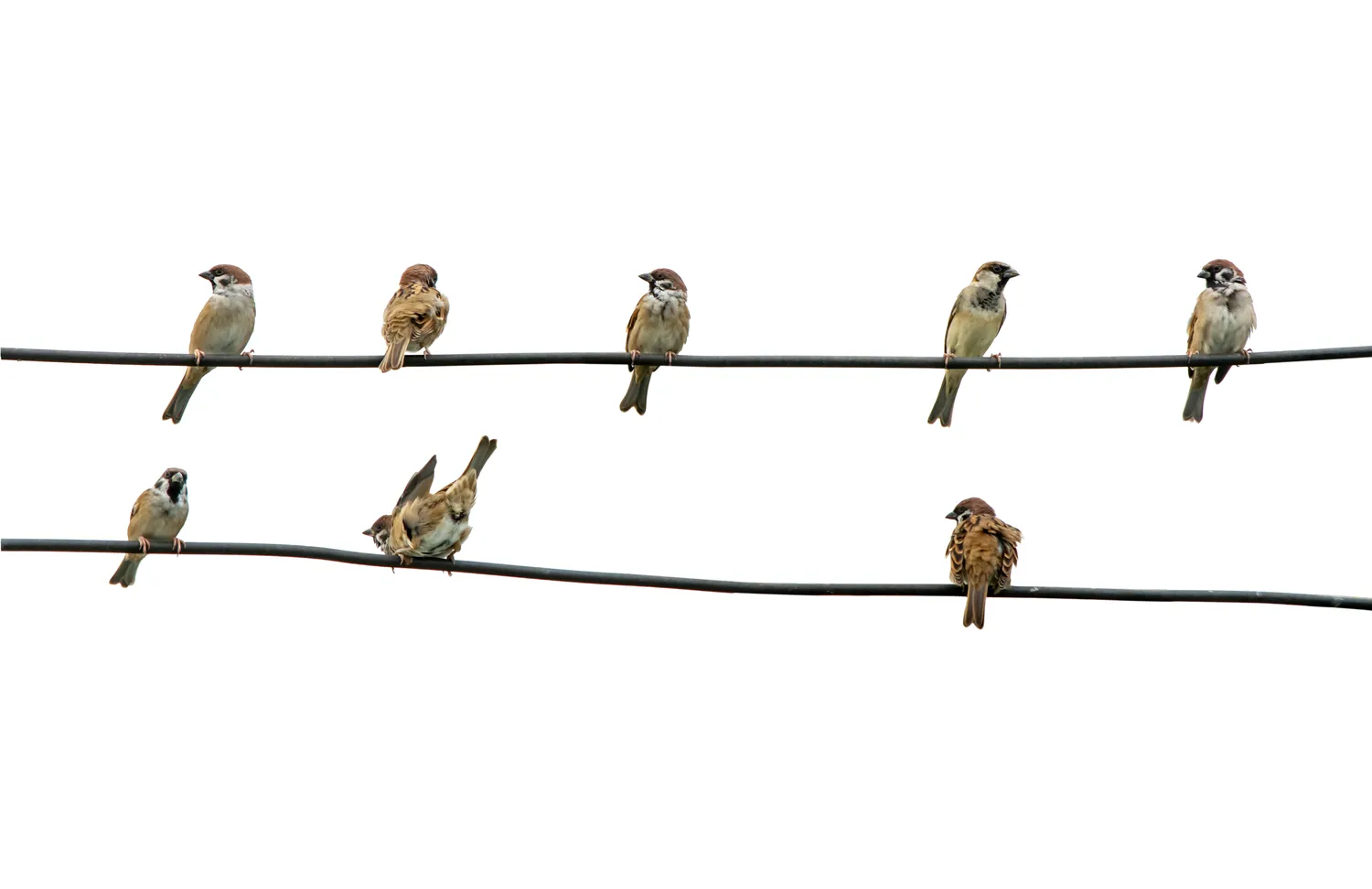 Paukščiai ant laidų yra gyvas priminimas, kad įtampa be kelio – nekenksminga.