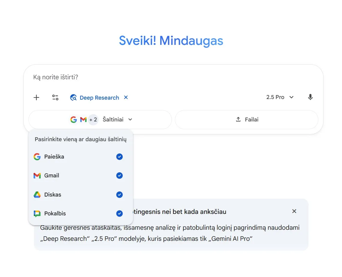 Naują funkciją rasite „Gemini“ programėlėje pasirinkę Įrankiai → Išsamūs tyrimai (Deep Research). Išskleidžiamajame meniu galima pažymėti, kuriuos šaltinius įtraukti: