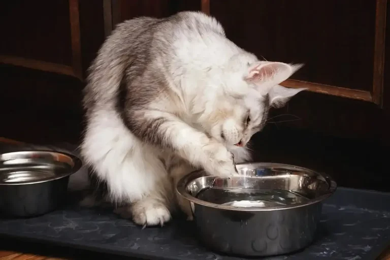 Katė tiria vandens dubenėlį letena, šalia stovi platus keraminis dubuo. Daugelis kačių renkasi šį būdą gerti vandenį dėl įvairių priežasčių.