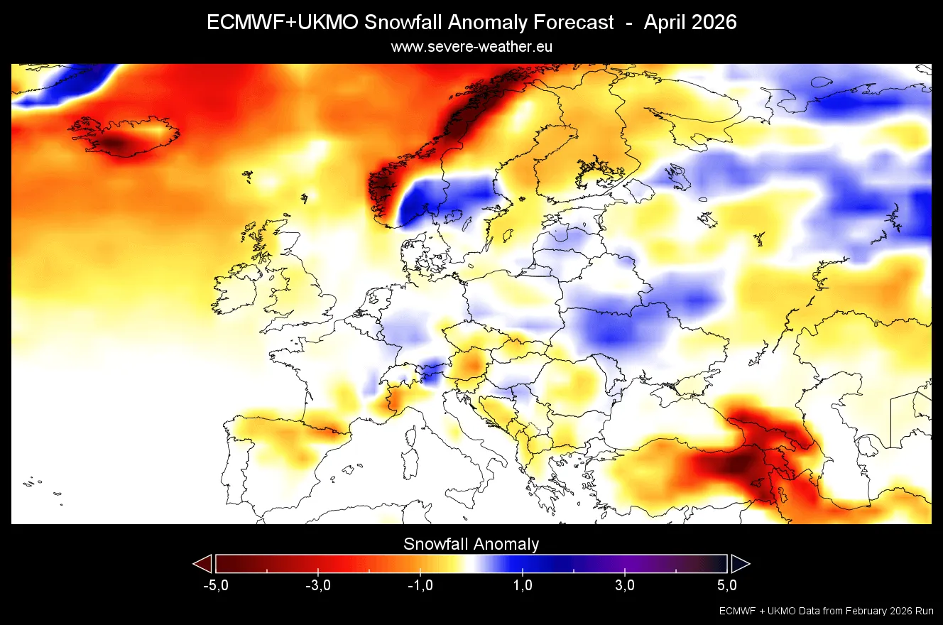 Tačiau balandžio mėnesiui galime pamatyti įdomią prognozę, kuri rodo įprastą arba didesnį nei įprasta sniego kiekį šiaurės ir centrinėje Europoje bei šiaurės ir rytų kryptimi. Tai gali rodyti gilesnę žemo slėgio sritį balandžio mėnesį virš centrinių dalių, o aukšto slėgio sritis kryps į šiaurę, sukurdama šiaurės rytų krypties srautą.