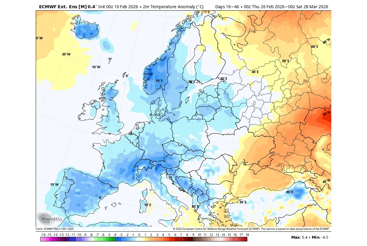 Išplėstinio diapazono ECMWF prognozės tendencija rodo slėgio anomaliją vasario pabaigos–kovo mėn. laikotarpiui. Virš Grenlandijos matomas aukšto slėgio regionas. Dėl to virš vakarų-centrinės Europos susidaro žemo slėgio zona, sukurianti nepastovius orus visame žemyne.