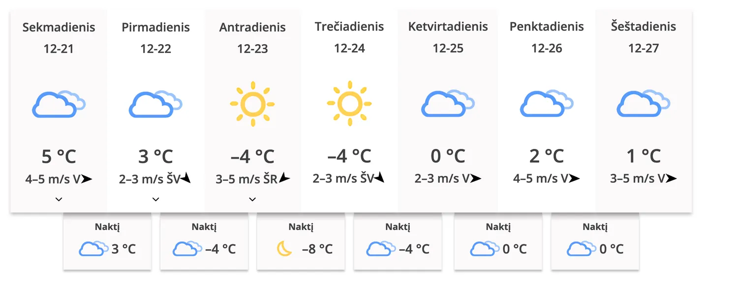 Antradienį situacija keisis iš esmės. Dangus pragiedrės, tačiau kartu ims skverbtis šaltesnis oras – dieną temperatūra kris iki –4 laipsnių, o naktį atšals net iki –8 laipsnių. Trečiadienį ir ketvirtadienį išliks saulėti, bet jau žiemiški orai: dienomis –3…–4 laipsniai, naktimis iki –9 laipsnių.