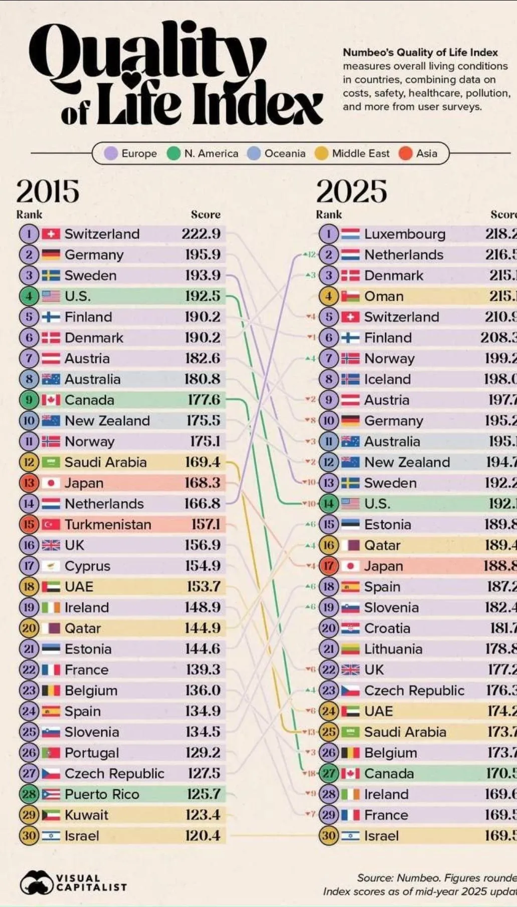 „Numbeo” paskelbtas gyvenimo kokybės indeksas atskleidžia stulbinančius pasikeitimus tarp 2015 ir 2025 metų. Šis indeksas vertina pragyvenimo išlaidas, saugumą, sveikatos priežiūros kokybę, taršos lygį ir kitus rodiklius, remiantis vartotojų apklausomis.