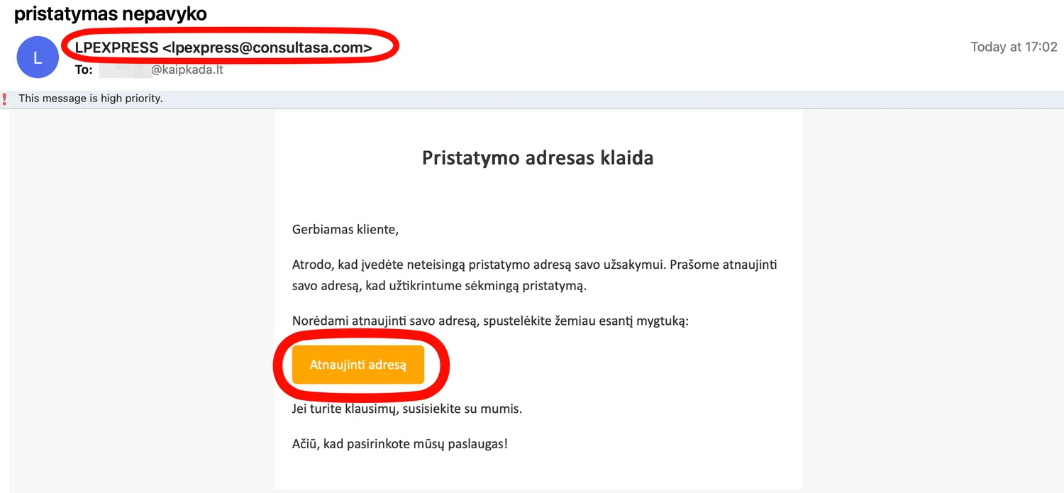 Pastarosiomis savaitėmis Lietuvos gyventojai vis dažniau sulaukia el. laiškų su iš pirmo žvilgsnio paprasta žinute: esą nurodytas neteisingas pristatymo adresas, todėl siunta negali būti pristatyta. Laiškas atrodo oficialus, mandagus, be gramatinių klaidų, o apačioje – mygtukas „Atnaujinti adresą“. Tačiau būtent čia ir slypi pavojus.