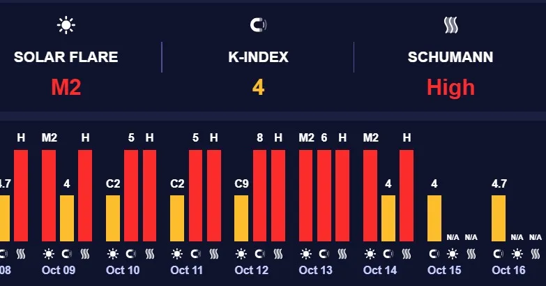 Spalio 13 d. stebėtojai užfiksavo du M klasės žybsnius – pakankamai galingus, kad sukeltų trumpalaikius radijo ryšio sutrikimus ir paveiktų kosmoso orus. Mokslininkai dabar analizuoja duomenis, siekdami nustatyti, ar juos lydėjo naujas plazmos išmetimas.