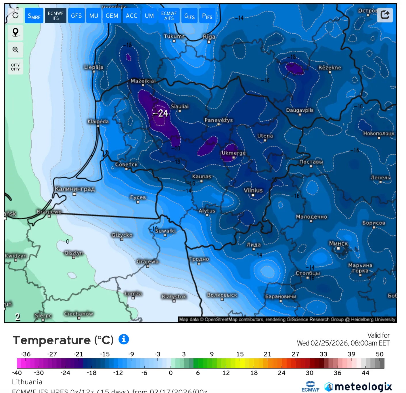 - Jutiminė temperatūra (Wind Chill): Tai pavojingiausia dalis. Dėl numatomo žvarbaus šiaurės/šiaurės rytų vėjo, jutiminė temperatūra gali siekti net -30°C.