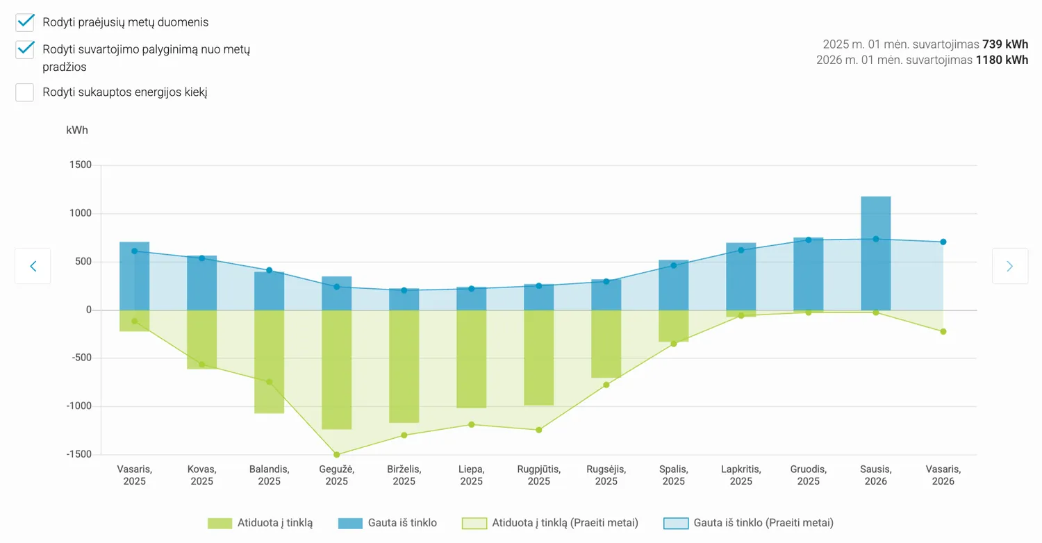 - Mėlyna zona (viršuje): Tai mano suvartojimas. Vasarą jis minimalus (apie 200-300 kWh), o žiemą išauga.