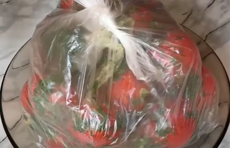 Dėl patikimumo įdėkite uždarytą maišelį į kitą maišelį. Užriškite jį vienu mazgu ir padėkite ant lėkštės, kad nepratekėtų. Palikite pomidorus tokiame pavidale 2 valandoms.