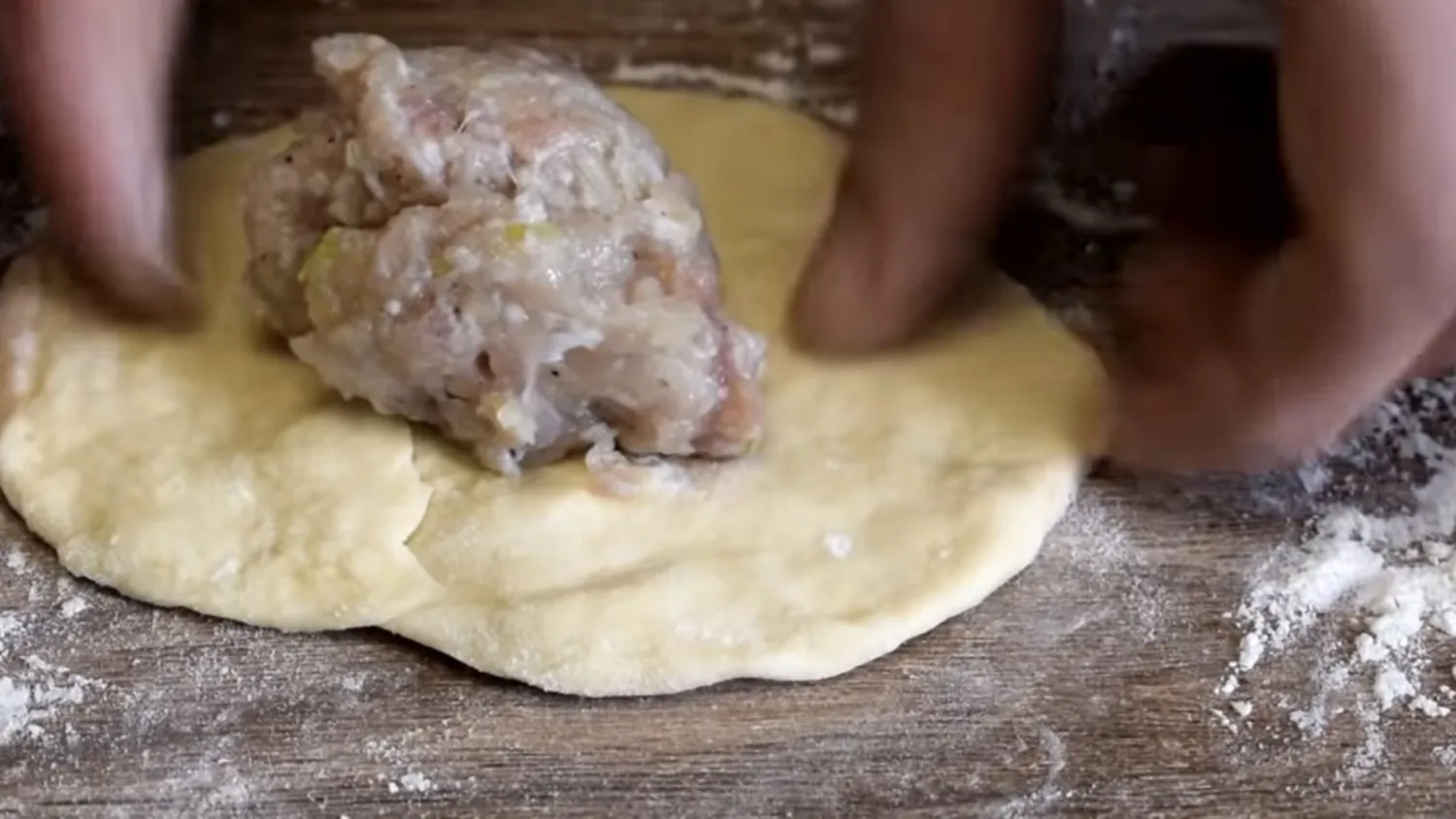 Sumaišykite kefyrą, kiaušinį, druską, cukrų, kepimo sodą ir aliejų. Tada palaipsniui suberkite miltus ir maišykite, kol gausite minkštą, prie rankų nelimpančią tešlą. Gali tekti minkyti šiek tiek ilgiau – paprastai tai priklauso nuo miltų. Tada leiskite tešlai 10 minučių pailsėti šiltoje vietoje, kol paruošite įdarą.