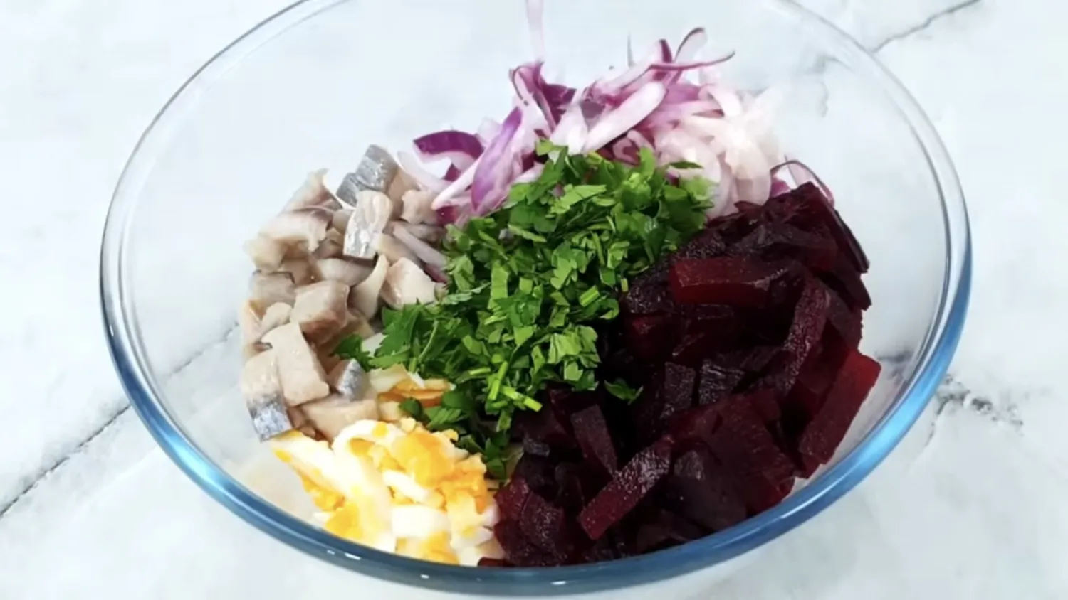 Silkę ir virtus kiaušinius supjaustykite mažais, vienodo dydžio kubeliais. Tą patį padarykite su burokėliais – taip salotos atrodys estetiškai ir bus malonu valgyti. - Sumaišykite salotas.