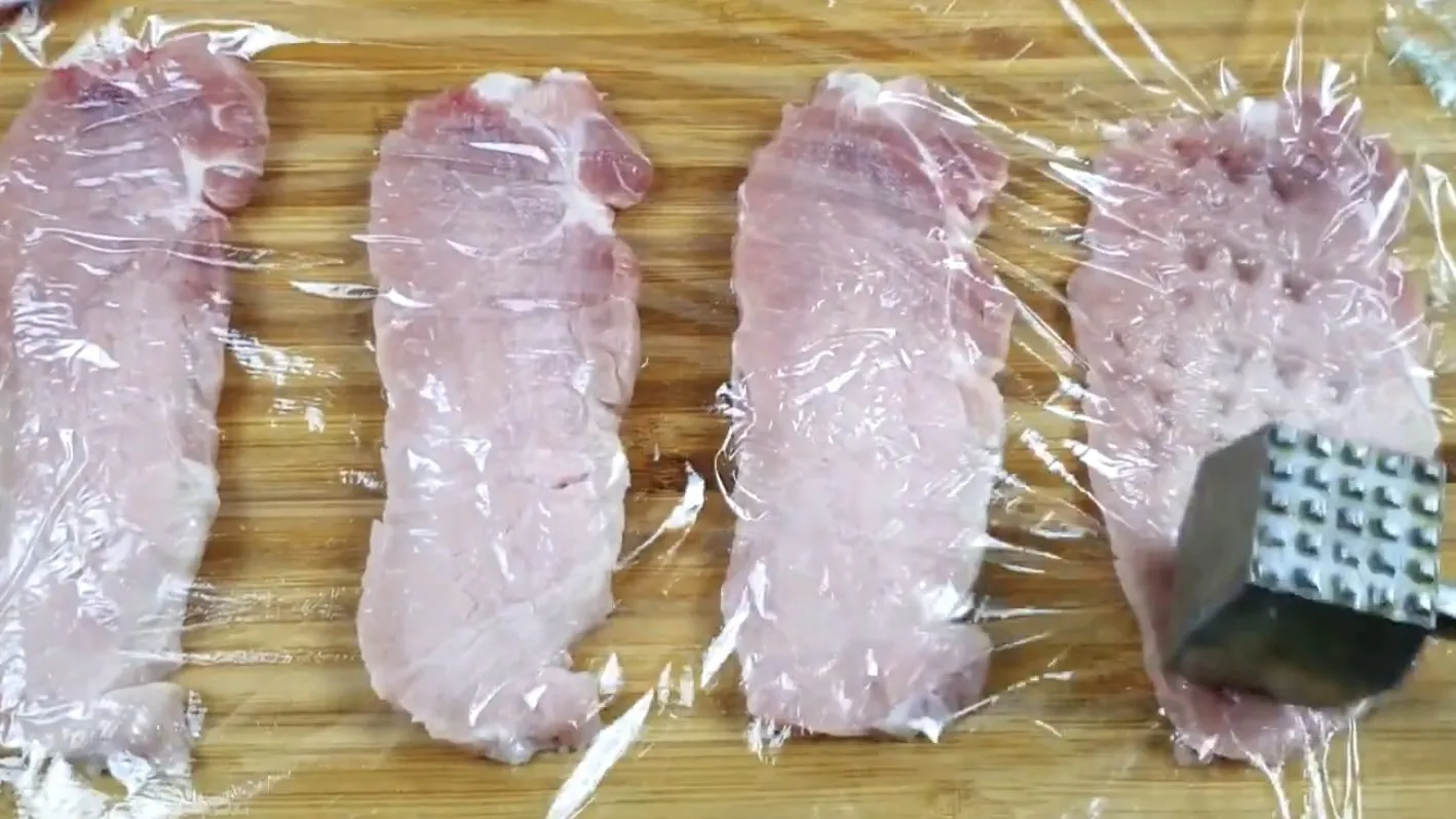 Kiaulienos mėsą supjaustykite maždaug 1,5–2 centimetrų storio kepsniais ir virtuviniu plaktuku sumuškite iš abiejų pusių, kad mėsa būtų plona ir minkšta. Kuo stipriau sumušite mėsą, tuo lengviau bus ją susukti. Kiekvieną mėsos gabalėlį pabarstykite druska ir pipirais.