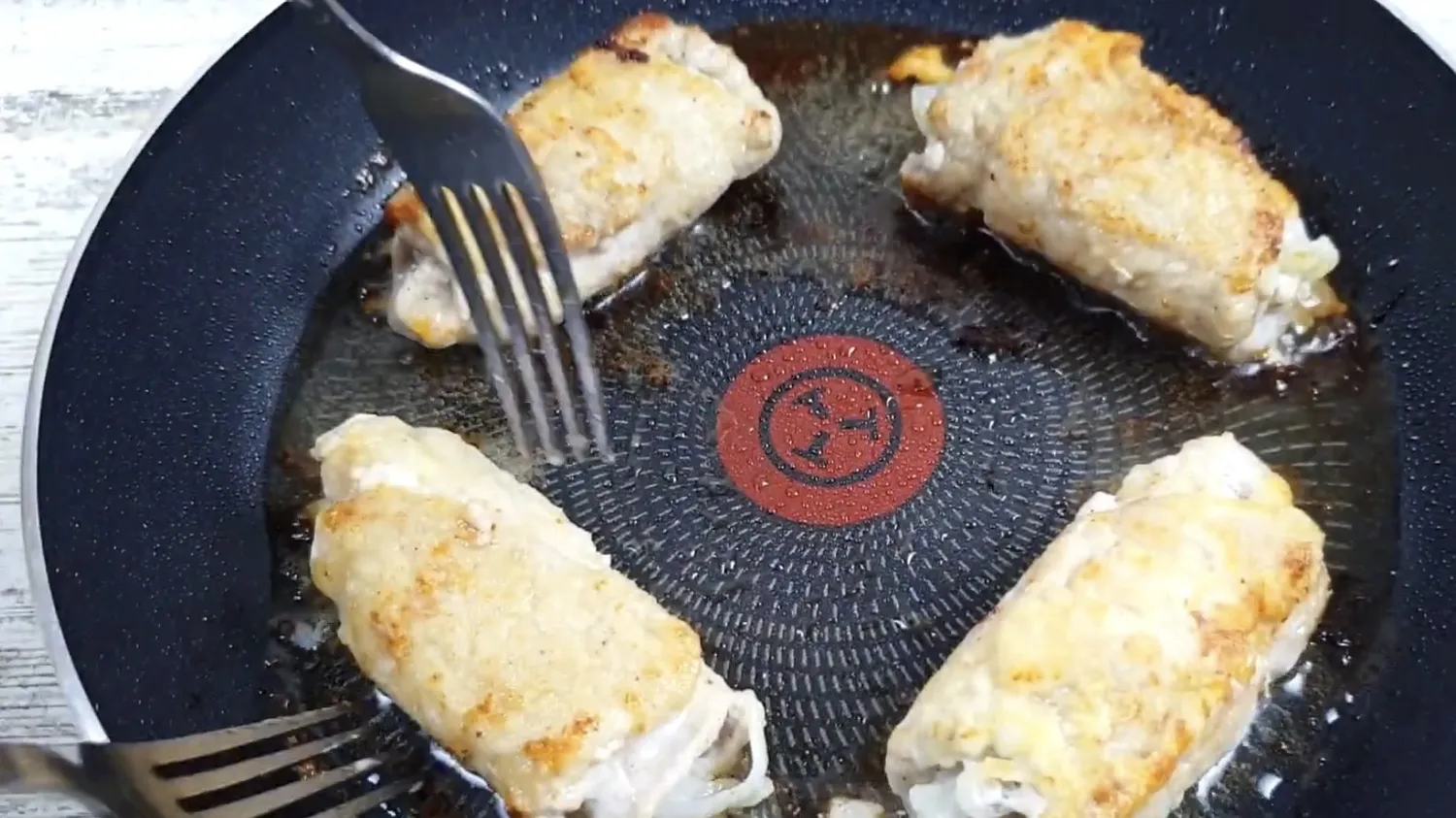Susuktuosius suktinukus apvoliokite miltuose ir kepkite karštoje keptuvėje su aliejumi. Sudėkite suktinukus siūle žemyn, kad jie iš karto sustingtų ir neišsivyniotų. Kai suktinukai iš visų pusių taps auksinės rudos spalvos, išimkite juos iš keptuvės.