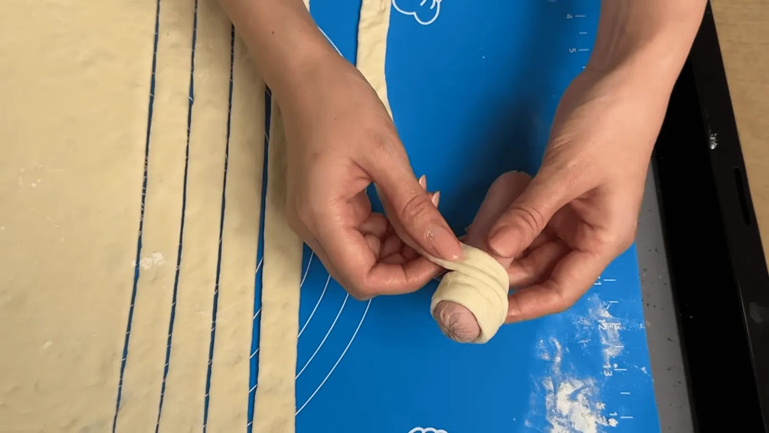 Imkite po dešrelę ir kiekvieną jų rūpestingai apvyniokite tešlos juostele. Vyniokite spirale, šiek tiek perdengdami kraštelius (kad neliktų tarpų), tačiau jokiu būdu netempkite tešlos – leiskite jai laisvai apglėbti įdarą.