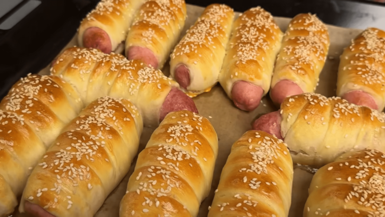 Ištraukę iš orkaitės, leiskite dešrelėms šiek tiek pravėsti, bet patiekite dar šiltas. Tešla bus neįtikėtinai minkšta ir švelni, o dešrelės viduje – sultingos.