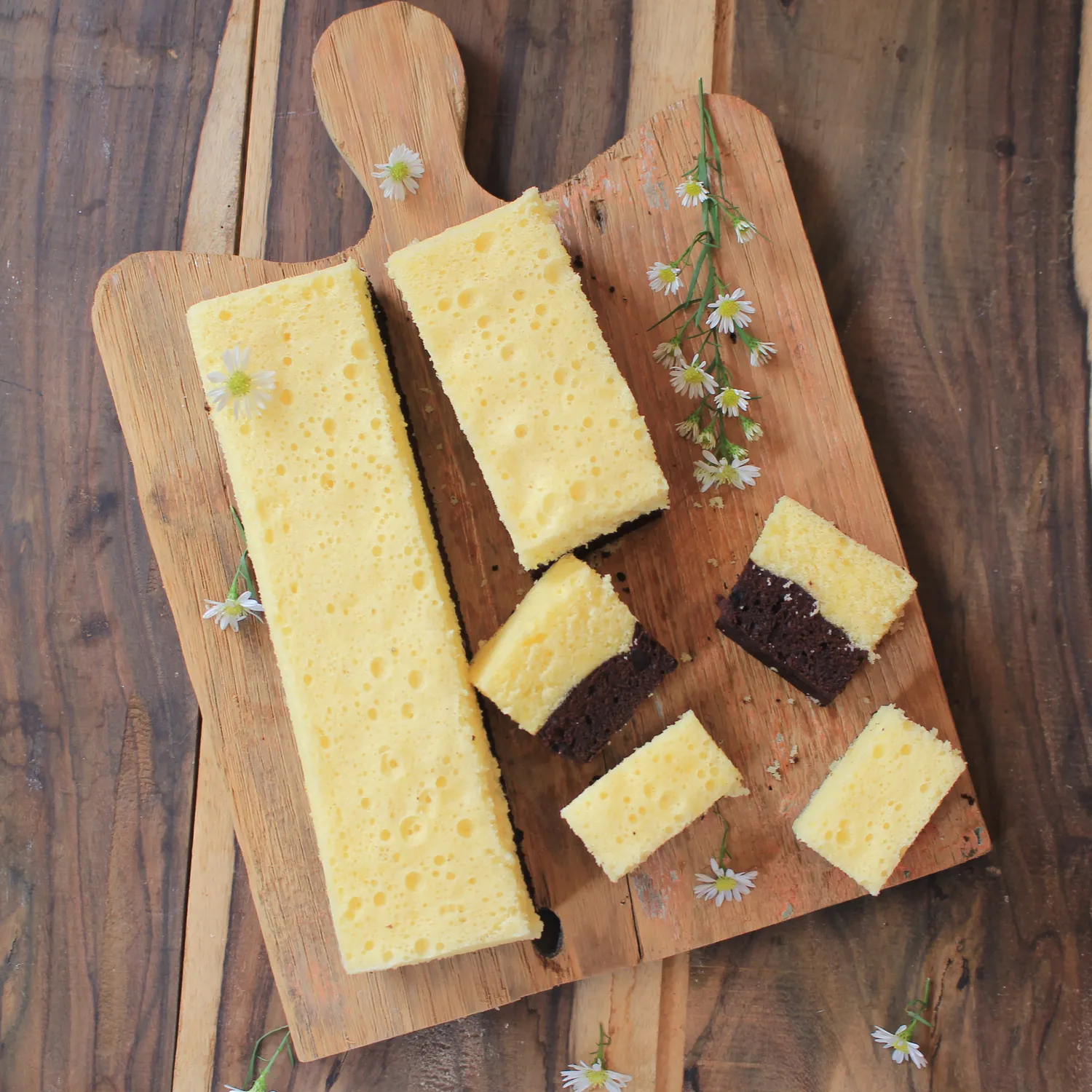 2-asis biskvito sluoksnis: Tuo tarpu paruoškite antrą sluoksnį. Atskirkite kiaušinių trynius nuo baltymų ir išplakite baltymus iki standžių putų. Trynius išplakite su cukrumi iki putų, tada supilkite aliejų ir miltus. Galiausiai atsargiai įmaišykite baltymų putas. Iškepus pirmajam sluoksniui, ant jo supilkite antrąjį mišinį ir kepkite dar 10 minučių 200 °C temperatūroje.