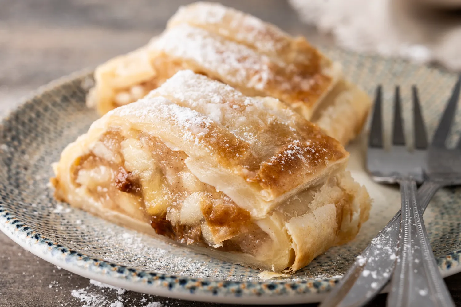 Šis obuolių štrudelis priklauso antrajai kategorijai. Prieš dvidešimt metų paragavau jo pas draugą, iškaulijau receptą ir nuo to laiko kepu visą žiemą. Mano šeima jau juokauja, kad parduotuvėse obuoliai baigsis greičiau nei mūsų noras gerti arbatą su šiuo traškiu desertu.