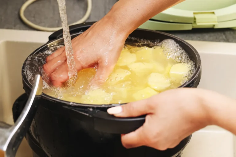 Trumpas „karštas dušas“ išverda paviršinį krakmolą – susiformuoja plona plėvelė, kuri neleidžia riekelėms sugerti perteklinio aliejaus. Būtent ši plėvelė vėliau virtuvėje tampa auksine, traškia odele.