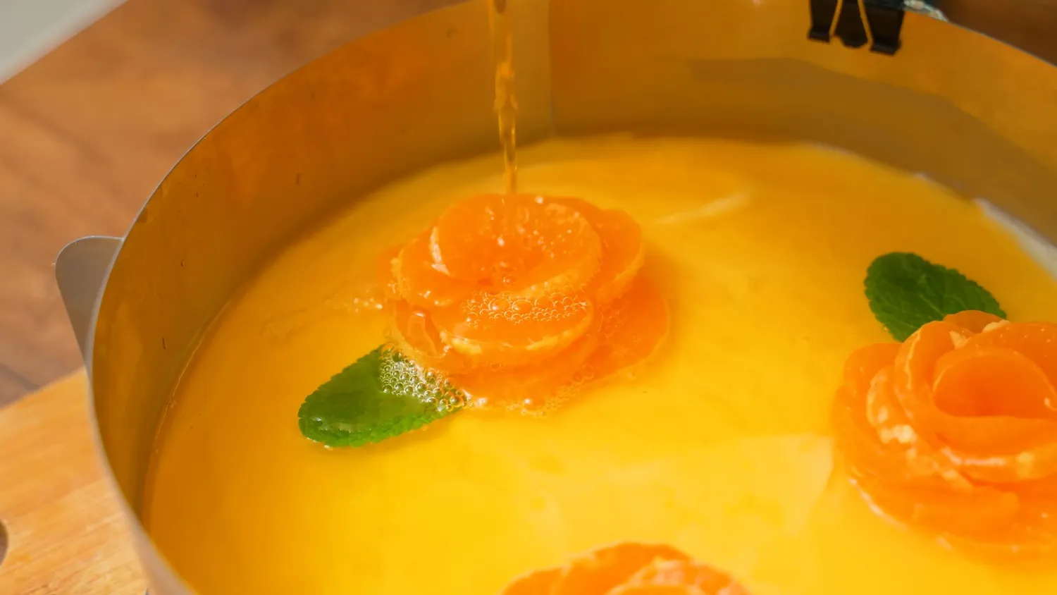 Iš šaldiklio išimkite formą su pagrindu, užtepkite kremą ir išlyginkite paviršių. Ant viršaus išdėliokite mandarinų skilteles – galima suformuoti žiedus ar spiralę. Atsargiai užpilkite atvėsusią želė, stengdamiesi nepažeisti kremo sluoksnio.