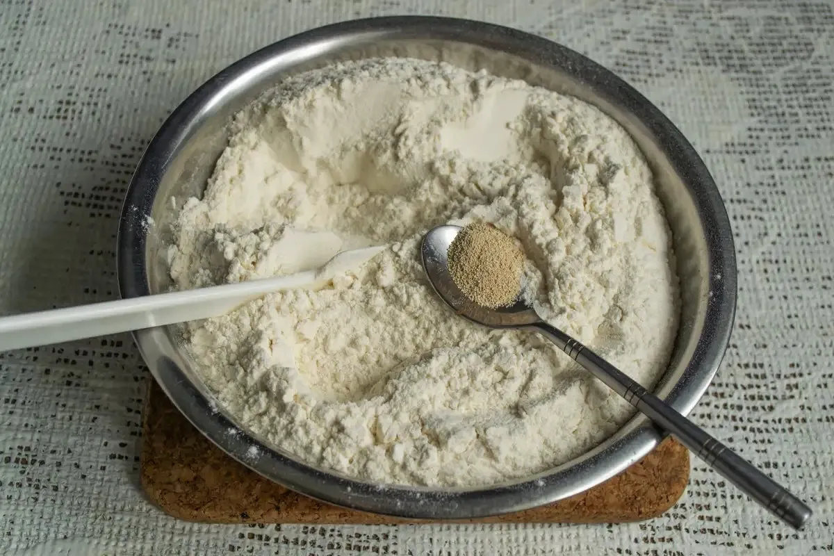 1. Sumaišykite sausus ingredientus: į didelį dubenį suberkite miltus, druską, cukrų (arba medų) ir sausas mieles. Jei naudojate šviežias mieles, ištirpinkite jas drungname vandenyje mažame dubenyje, kol pradės burbuliuoti.