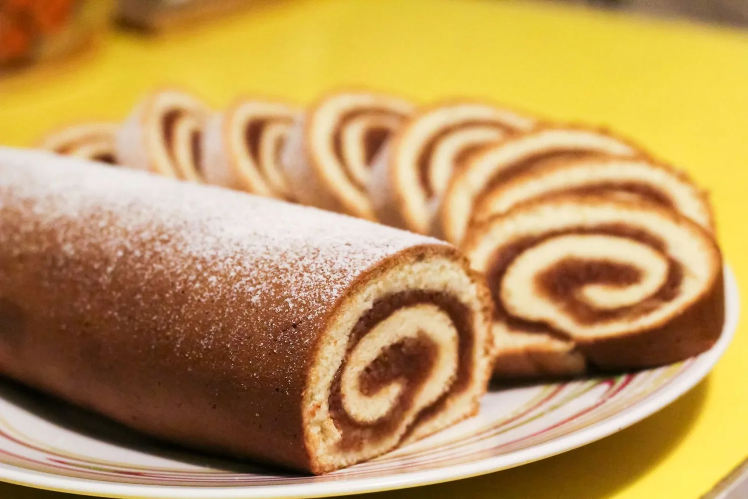 - Kai visiškai atvės, išvyniokite ir pertepkite pagal pageidavimą (pvz., uogiene arba grietinėle), tada vėl susukite ir patiekite.