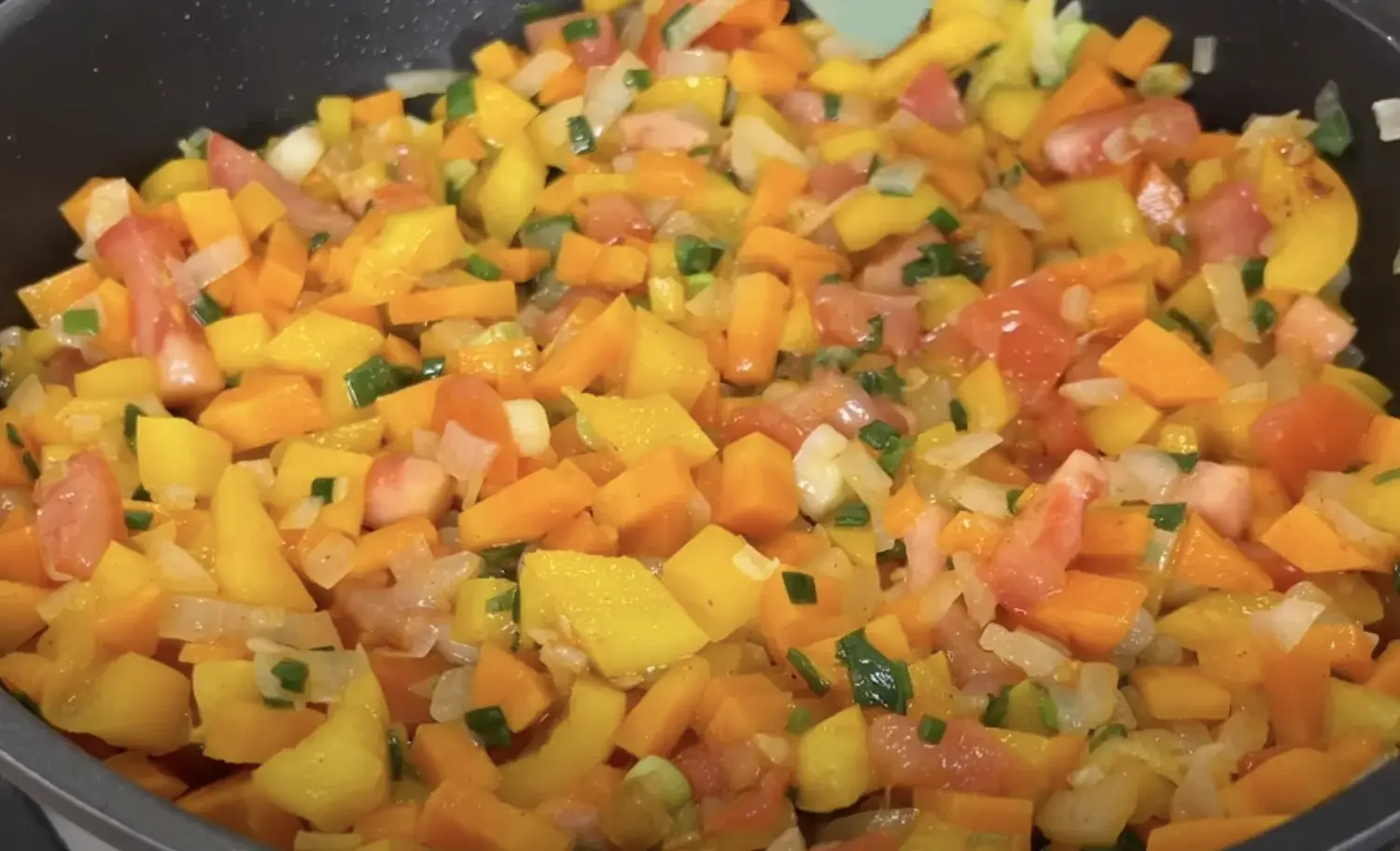 - Moliūgą, morką, svogūną, papriką ir pomidorą supjaustykite mažais kubeliais.
