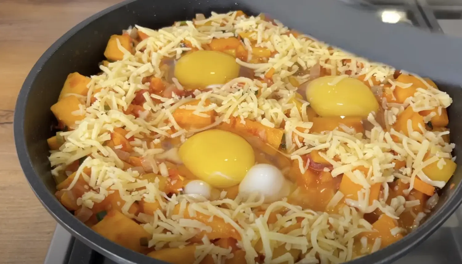 Moliūgas tampa minkštas ir saldus, daržovės išlaiko savo tekstūrą, o sūris ir kiaušiniai suteikia sotumo.