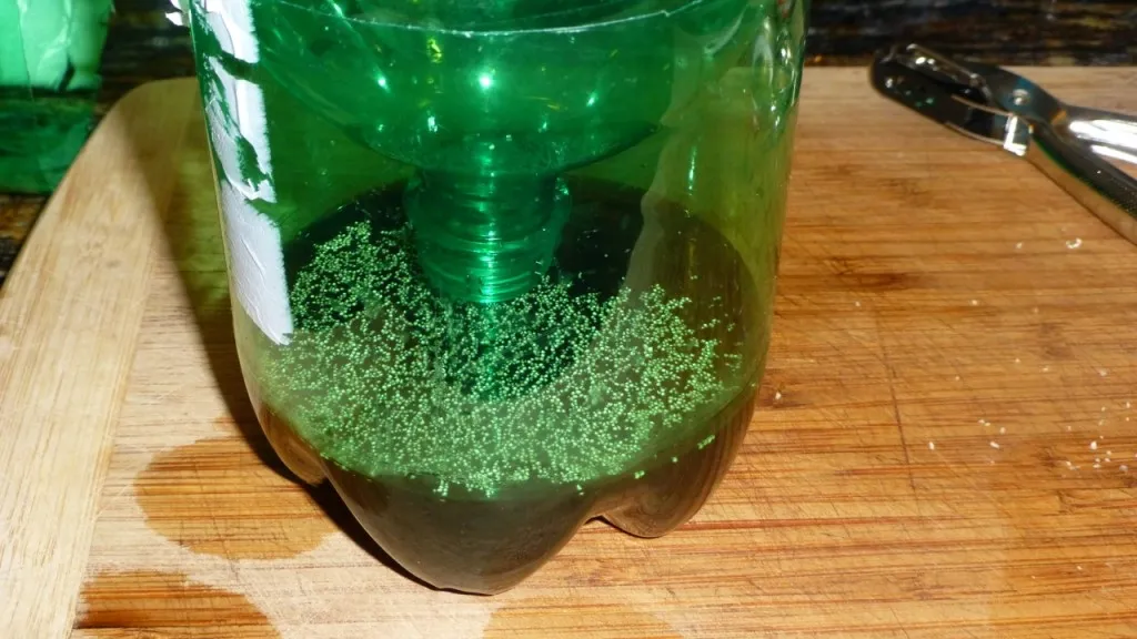 Į apatinę butelio dalį įberkite vieną valgomąjį šaukštą cukraus. Tada įpilkite stiklinę šilto, bet ne per karšto vandens, ir viską išmaišykite, kad cukrus ištirptų. Po to suberkite apie 1 gramą sausų mielių. Kai mišinys pastovės apie 15–20 minučių, jis pradės aktyviau veikti – susidarys putos ir pradės išsiskirti anglies dioksidas.
