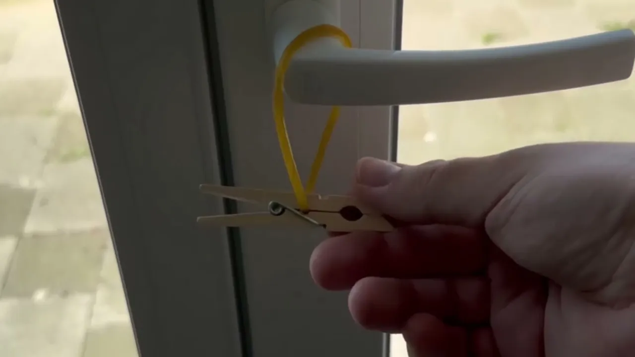 Kai toks paprastas „įtaisas“ jau paruoštas, galima eiti prie terasos durų. Durų rankeną reikia palikti tokioje padėtyje, kad būtų galima išeiti į lauką. Tuomet gumytė užmaunama ant rankenos. Atidarius duris, segtukas lieka kaboti ant gumytės, o išeinant į lauką jį reikia pasiimti su savimi, šiek tiek patempiant gumą.