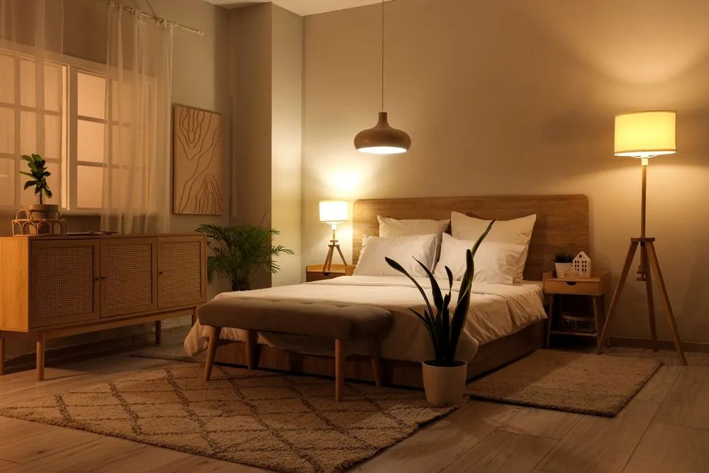 Apšvietimas daro didelę įtaką kambario nuotaikai. Be pagrindinio lubų šviestuvo verta turėti ir papildomų šviesos šaltinių – stalo ar sieninių lempų, LED juostų ar girliandų. Šiltos spalvos lemputės suteikia ramesnę atmosferą, o skirtingi apšvietimo lygiai leidžia lengviau pritaikyti šviesą tiek poilsiui, tiek skaitymui ar darbui lovoje.