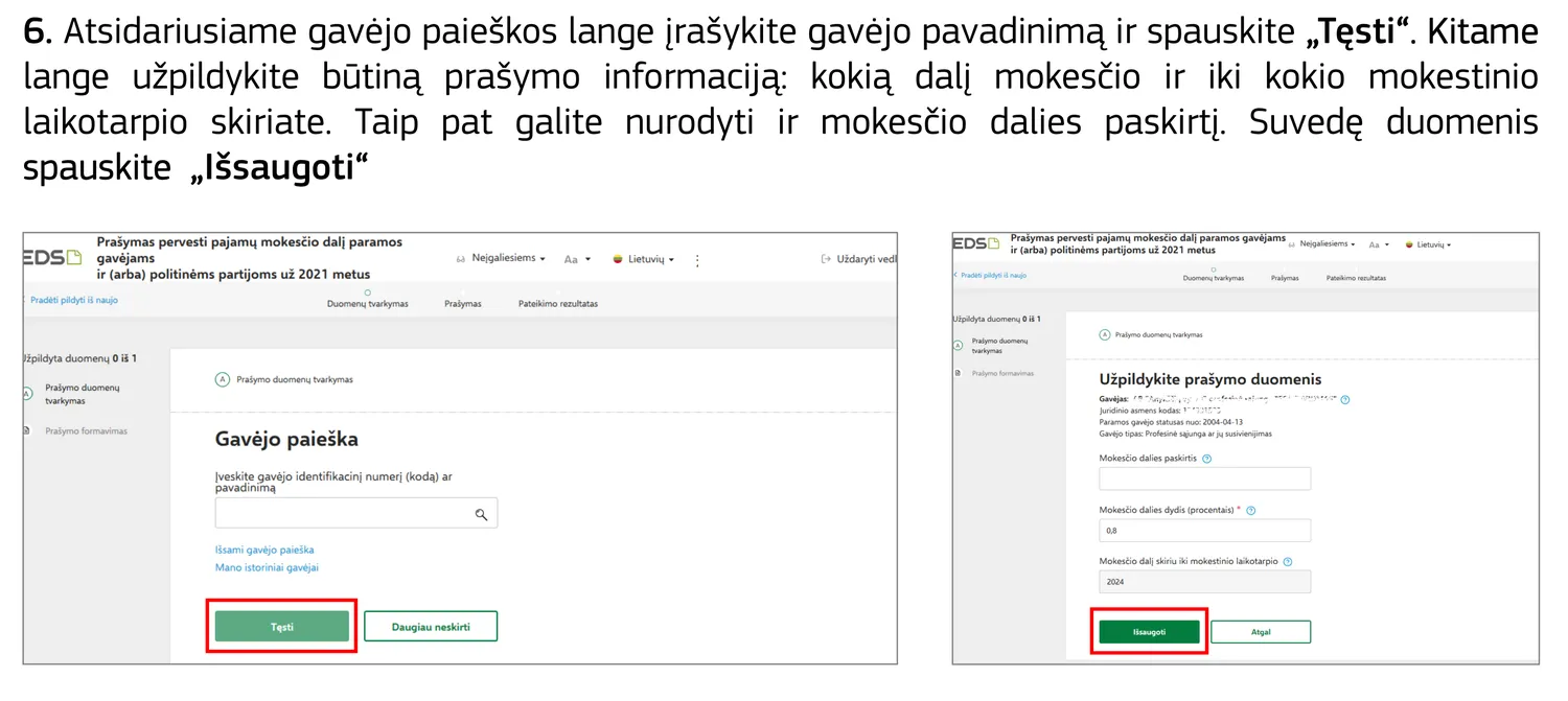 Jei norite skirti dalį (0,6%) partijai ar profsąjungai, vedlys leis pridėti naują eilutę. Procedūra ta pati – randate gavėją, įrašote procentą.