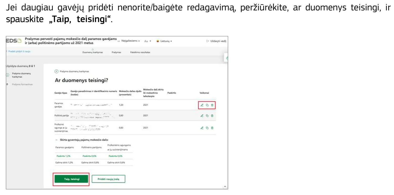 - Peržiūrėkite suvestinę. Ar teisingi gavėjai? Ar procentai neviršija leistinų normų (maks. 1,2% NVO, 0,6% partijoms)?