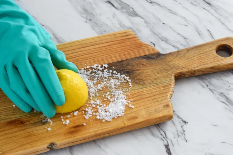 Ant sausos lentelės paviršiaus užberkite rupios druskos, tada perpjaukite citriną per pusę ir trinkite ją perpjauta puse į lentą sukamaisiais judesiais. Druska veikia kaip švelnus šveitiklis, o citrina – kaip natūralus dezinfektantas.