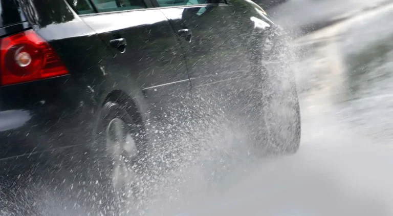 Jei pajuntate hidroplanavimą – kai ratai praranda sukibimą ir automobilis pradeda slysti – nenuimkite kojos nuo akceleratoriaus, laikykite vairą tiesiai ir švelniai stabdykite, kol sukibimas grįžta. Venkite važiuoti per gilius vandens telkinius, nes vanduo gali patekti į variklį ar sukelti slydimą. Jei vanduo gilus, geriau apsisukti ir ieškoti kito kelio.