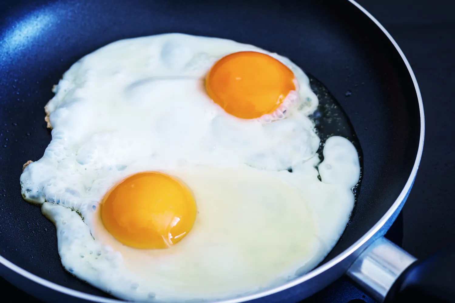 Pirmiausia įkaitinkite keptuvę ant vidutinės kaitros. Ne per stipriai. Jei keptuvė bus per karšta, baltymas labai greitai sukietės, kraštai pradės ruduoti, o trynys dar nespės iškepti taip, kaip reikia.