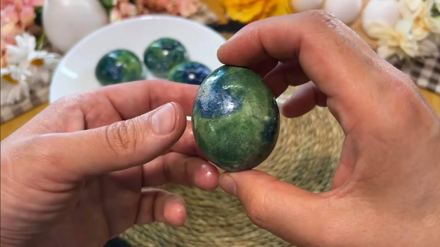 Pirmiausia – rezultatas. Kiaušiniai išeina ne šiaip spalvoti, o su natūraliais, netikėtais raštais. Kiekvienas vis kitoks, tarsi mažas meno kūrinys.
