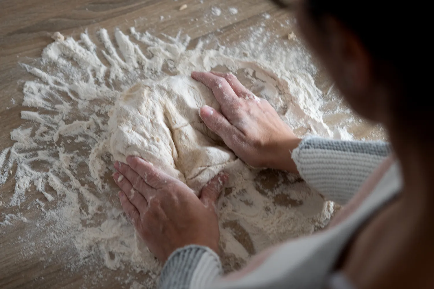 Įpilkite drungno vandens ir maišykite šakute ar mentele, kol susidaro kompaktiška tešla. Perkelkite ją ant lengvai miltais pabarstyto paviršiaus ir minkykite tik minutę ar dvi — kol taps lygi ir nebelips prie rankų. Sulenkite kaip voką ir suformuokite kepalą. Nesistenkite per daug — čia ne biskvitas, paprastumo šypsosi. 😊