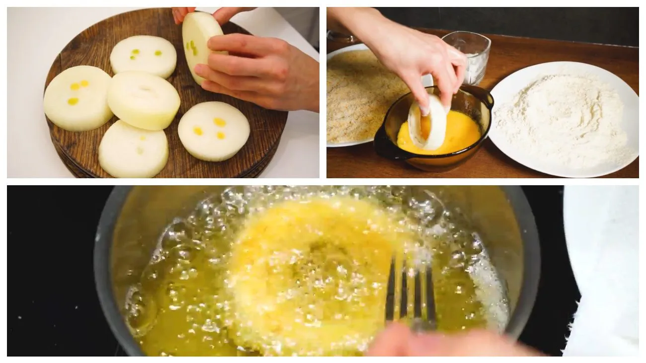 Tuomet pasiruoškite tris dubenis: viename tebūna miltai, kitame išplakti ir lengvai pasūdyti kiaušiniai, trečiame – džiūvėsėliai. Kiekvieną žiedą pirmiausia apvoliokite miltuose, po to merkite į kiaušinį ir galiausiai gerai išvoliokite džiūvėsėliuose. Jei norisi dar traškesnės plutelės, tą patį galima pakartoti antrą kartą – vėl kiaušinis ir dar sykį džiūvėsėliai.