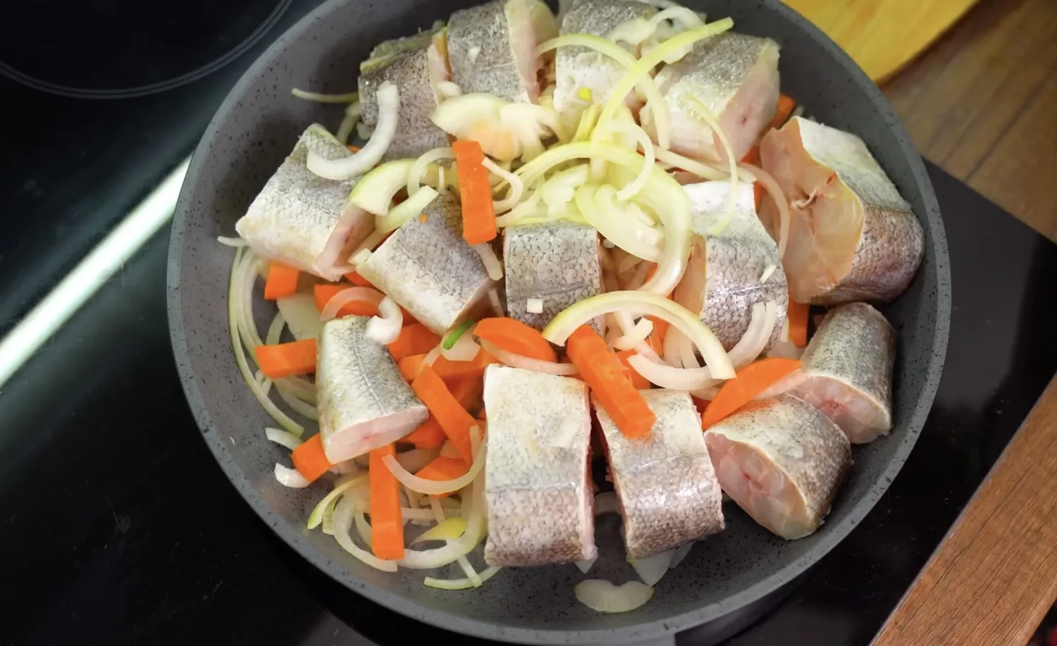 Į gilesnę keptuvę arba puodą dėkite sviestą ir leiskite jam ištirpti. Ant dugno paskleiskite pusę svogūnų ir morkų. Ant šio sluoksnio dėkite žuvies gabalėlius, o viršų užberkite likusiomis daržovėmis. Tada viską apibarstykite krapų stiebais, įdėkite lauro lapą, pipirų ir, jei reikia, dar truputį druskos.