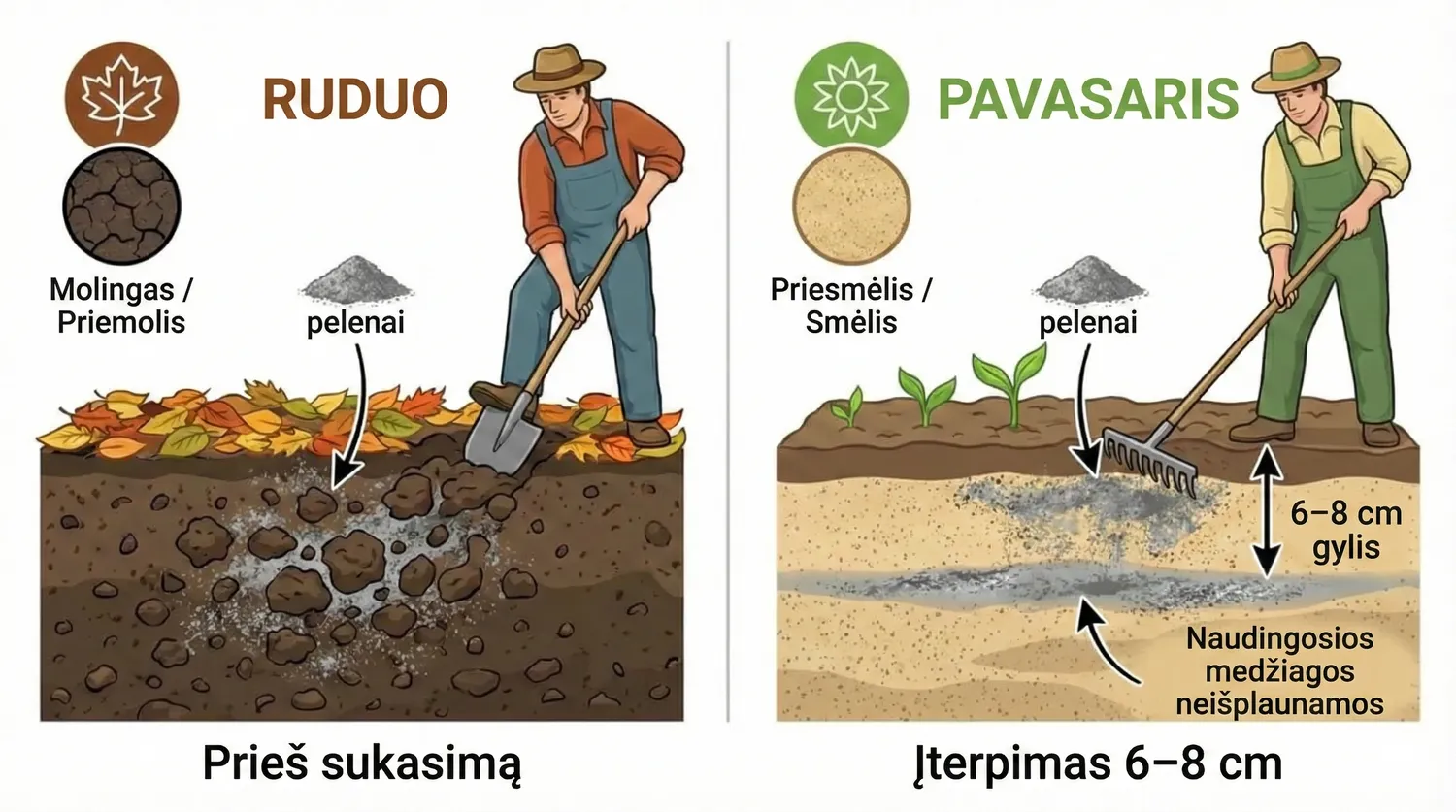 Sunkesnėse molio ir priemolio dirvose pelenus geriausia įterpti rudenį, prieš kasimą. Taip jie spėja „susirišti“ su dirvožemiu ir nepadaro šoko augalams pavasarį. Smėlingose dirvose situacija priešinga – čia uosis greitai išsiplauna, todėl jį verta naudoti pavasarį ir sekliau įterpti, kad maistinės medžiagos neišnyktų po pirmų lietų.