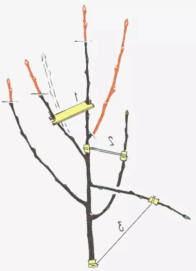 3. Teisingas šakų kampas – idealus kampas yra maždaug 90° nuo kamieno. Pernelyg vertikalios šakos duos mažiau vaisių, todėl jas galite sulenkti naudodami virvelę ir kuolą.
