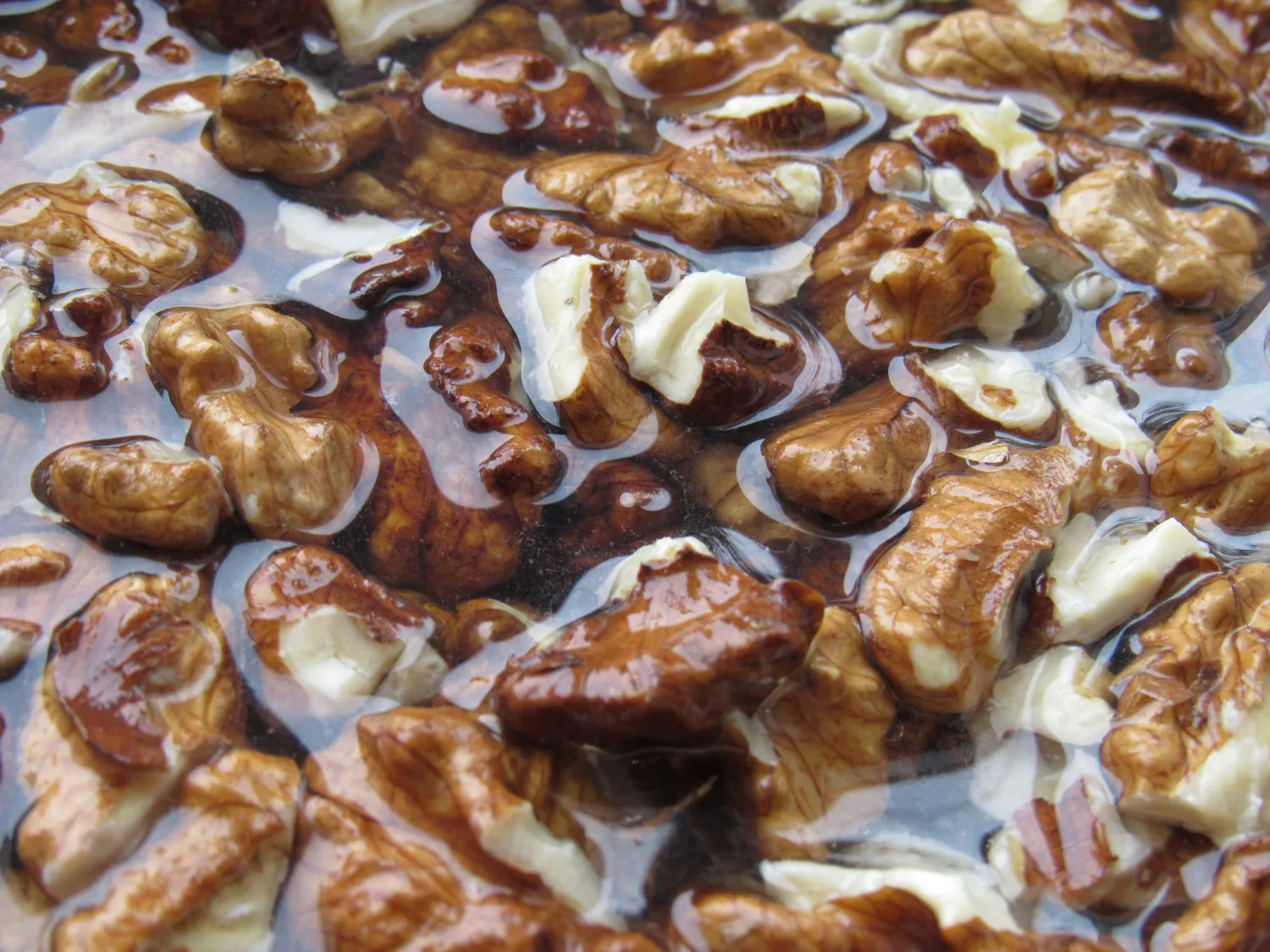 Po mirkymo kruopščiai nuplaukite riešutus po tekančiu vandeniu. Tai svarbu — kartu su vandeniu nusiplaus fitino rūgštis ir kitos išplautos medžiagos. Neplautu vandeniu neišpilkite ant augalų — jis gali būti per rūgštus.