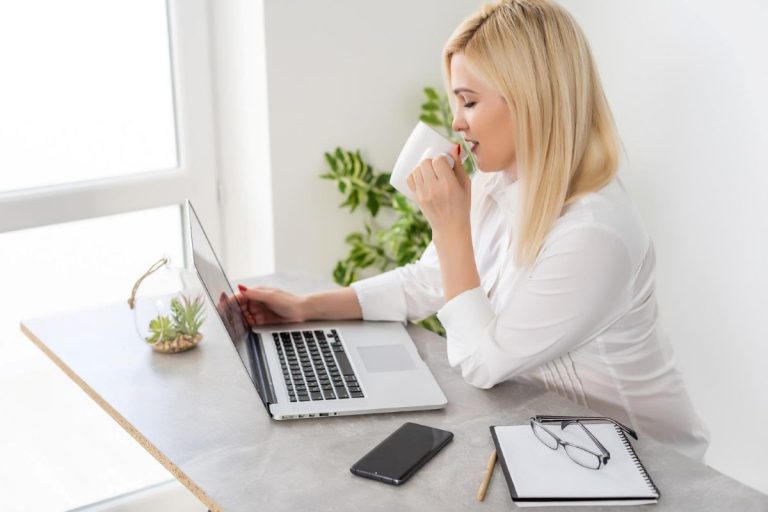 - Ergonomika: Ekranas akių lygyje (viršus ties akimis), 50–70 cm atstumu. Kėdė su atrama, kojos ant grindų 90° kampu. Naudokite stovimą stalą – keiskite poziciją kas 30 min.