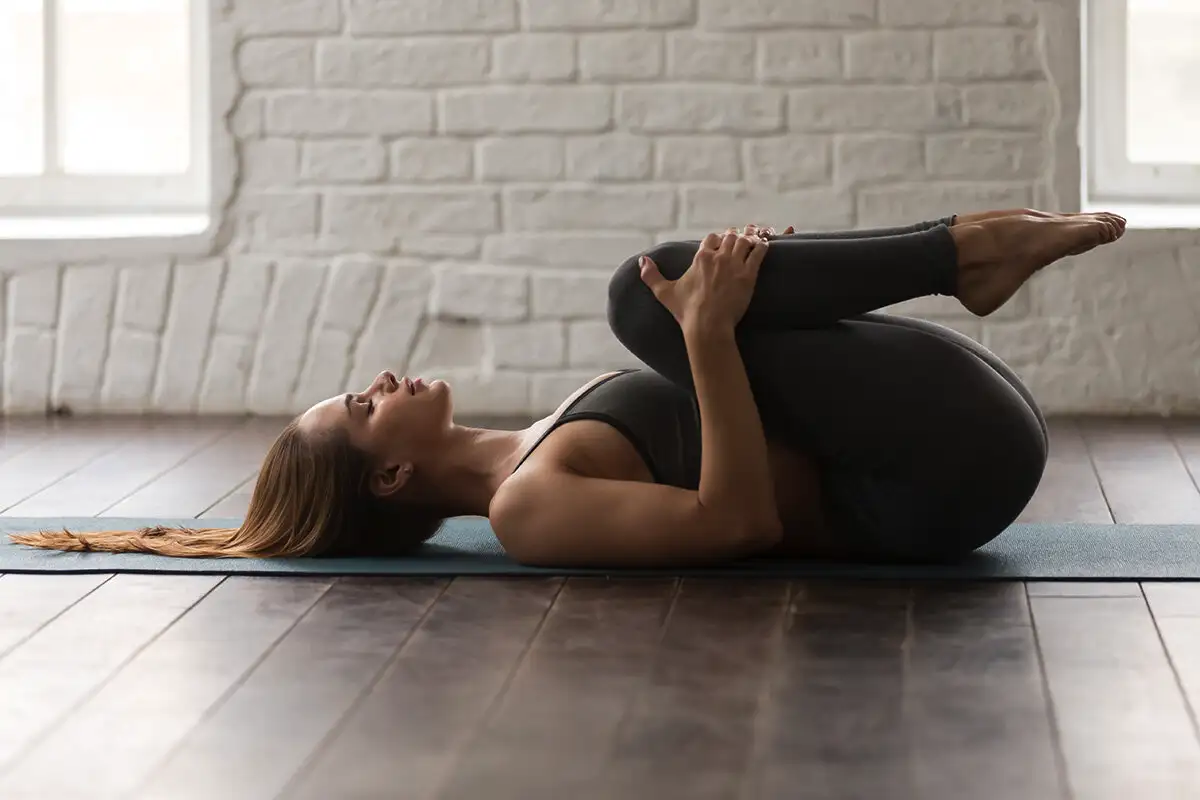 Sulenkite dešinąjį kelį ir rankomis pritraukite šlaunį prie pilvo. Grąžinkite koją į lovą ir pakartokite pratimą kairiąja puse. Iš viso atlikite keturis pakėlimus. Tada vėl pritraukite dešinę šlaunį prie pilvo, kairiąja ranka laikykite kelį ir dešinę ranką padėkite ant lovos pečių lygyje. Švelniai patraukite dešinį kelį į kairę pusę, link lovos, bet abu pečius laikykite ant lovos. Tempimas turėtų būti patogus, neskausmingas. Pakartokite judesį kairiąja puse ir dar po vieną kartą kiekvienoje pusėje.