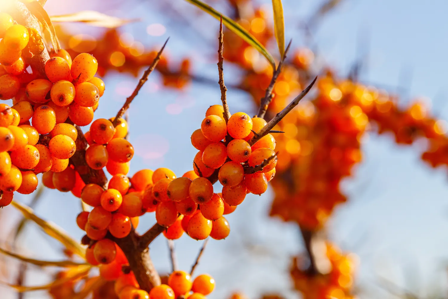Šaltalankis – tikras vitamino C čempionas: 100 gramų šviežių uogų turi net apie 275 mg vitamino C, kai tuo tarpu paros norma siekia vos 75–90 mg.
